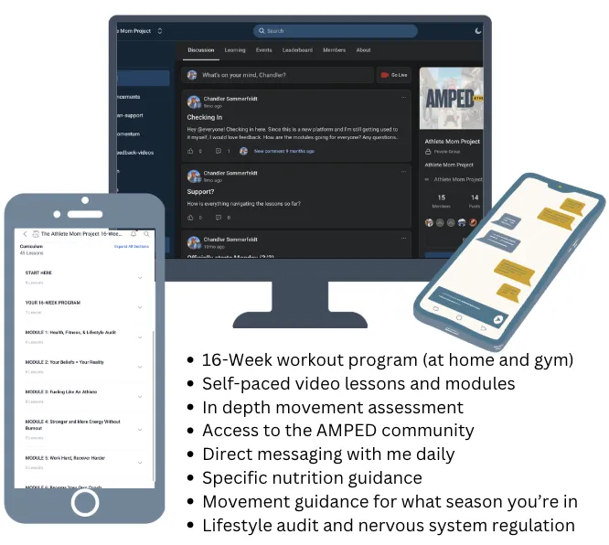 You’ll also gain access to the AMPED community for support and accountability, plus direct daily messaging with me so you’re never guessing or doing this alone. This isn’t a generic workout plan—it’s whole-body coaching that helps you build strength, regulate your nervous system, and sustain an athletic life through motherhood.